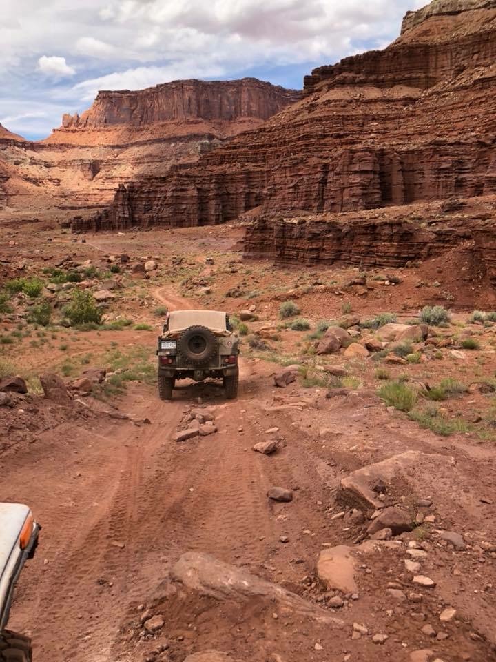 I finished adding the rear disc brake conversion the day before I left for a Moab Utah trail ride. 250 trail miles in 3 days, including Kane Creek and Elephant Hill. Both trails are rated difficult and were. Without power steering steep, technical, rocky, lots of ledges and drop offs are really outside the design specs of the pinzgauer. (At least for a 62 year old man with failing spinal vertebrae). I really pushed the pinz hard, never used the winch or took a strap.